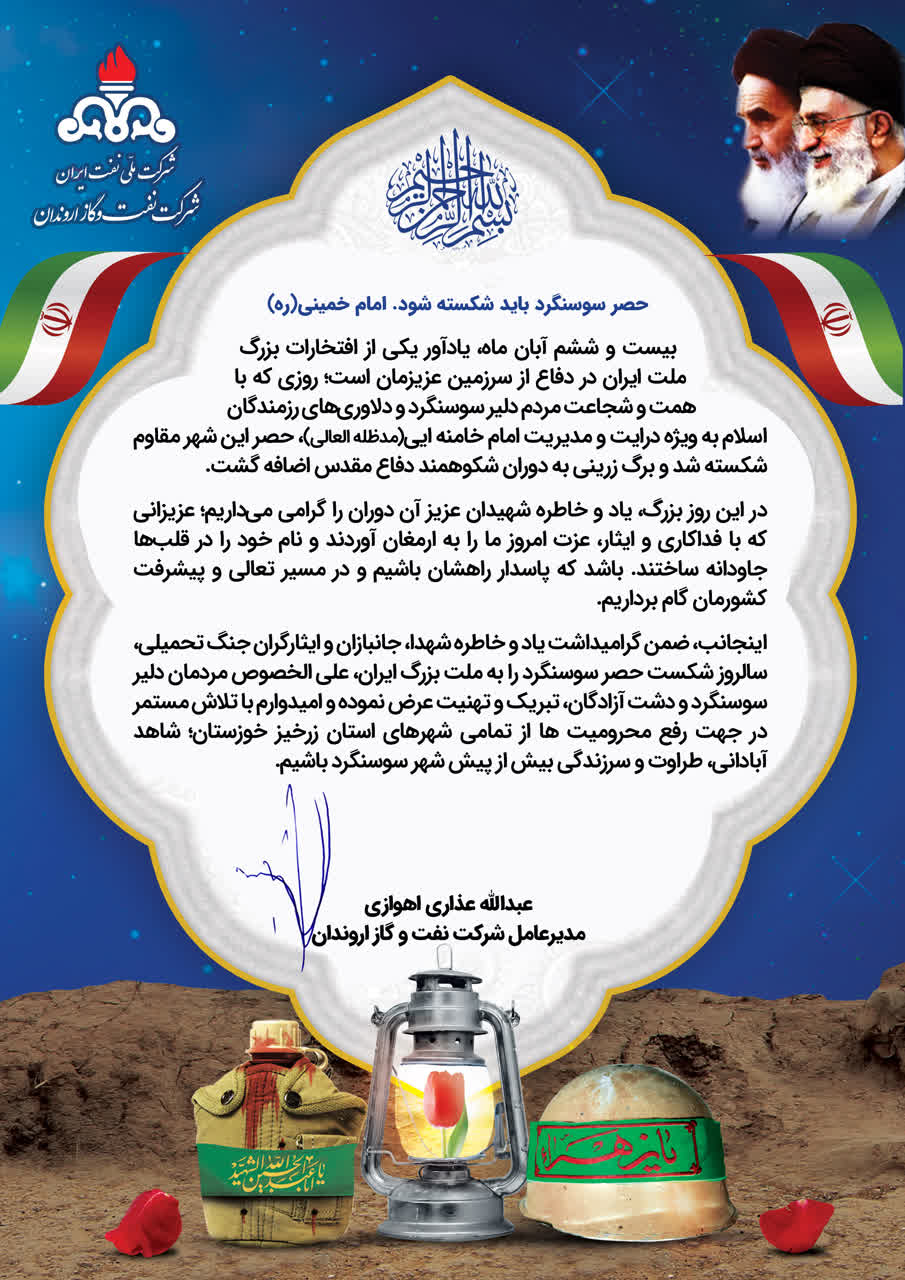 بیست و ششم آبان ماه، یادآور یکی از افتخارات بزرگ ملت ایران در دفاع از سرزمین عزیزمان است؛ روزی که با همت و شجاعت مردم دلیر سوسنگرد و دلاوریهای رزمندگان اسلام به ویژه درایت و مدیریت امام خامنه ایی(مدظله العالی)، حصر این شهر مقاوم شکسته شد و برگ زرینی به دوران شکوهمند دفاع مقدس اضافه گشت.