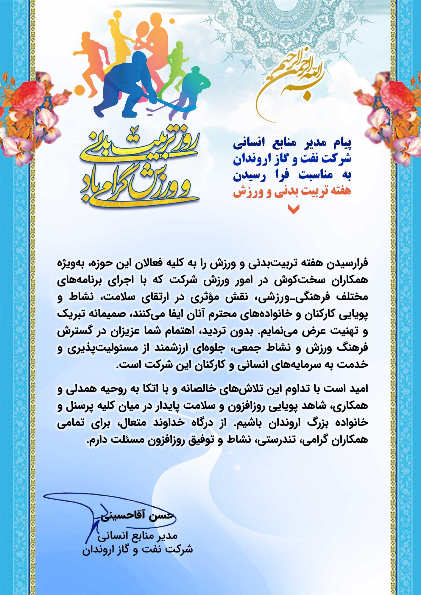 «فرارسیدن هفته تربیتبدنی و ورزش را به کلیه فعالان این حوزه، بهویژه همکاران سختکوش در امور ورزش شرکت که با اجرای برنامههای مختلف فرهنگیـورزشی، نقش مؤثری در ارتقای سلامت، نشاط و پویایی کارکنان و خانوادههای محترم آنان ایفا میکنند، صمیمانه تبریک و تهنیت عرض مینمایم. بدون تردید، اهتمام شما عزیزان در گسترش فرهنگ ورزش و نشاط جمعی، جلوهای ارزشمند از مسئولیتپذیری و خدمت به سرمایههای انسانی و کارکنان این شرکت است.